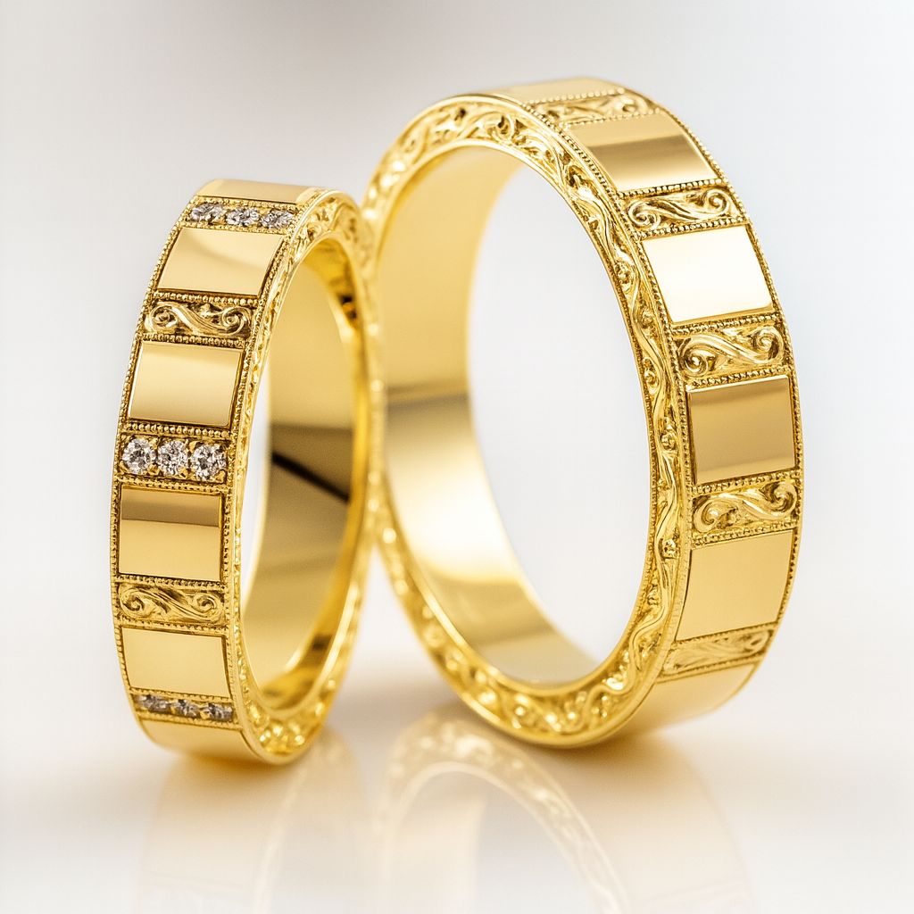 Alianças em ouro esculpidas à mão, onde cada detalhe revela a precisão e a sensibilidade do trabalho artístico.