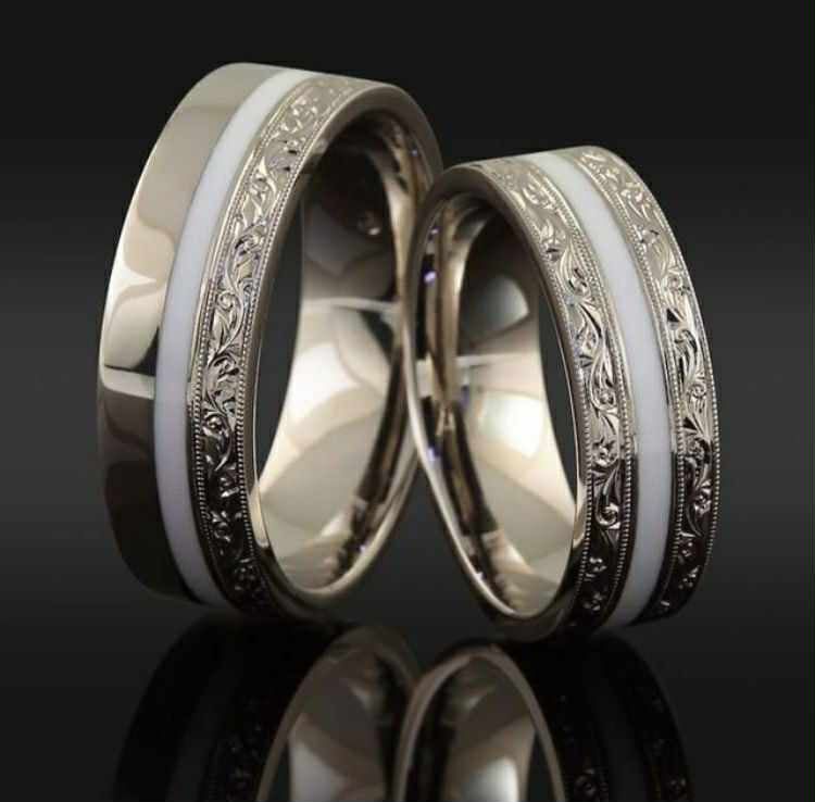 Par de alianças em prata 950 com acabamento polido de alto brilho e detalhes esculpidos à mão em relevo clássico. O design apresenta uma elegante faixa central branca, que contrasta harmoniosamente com o tom da prata, criando um visual sofisticado e atemporal.