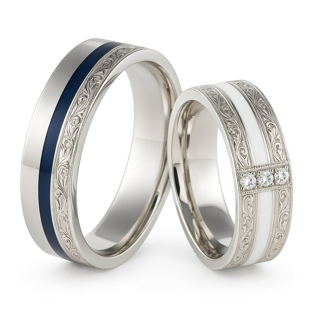 Par de alianças em prata 925, com acabamento polido espelhado e detalhes ricamente esculpidos à mão em estilo clássico. O modelo masculino traz uma elegante faixa central azul, que adiciona sofisticação e personalidade ao design. O modelo feminino é adornado com zircônias brilhantes, realçando o brilho e a delicadeza da peça.
