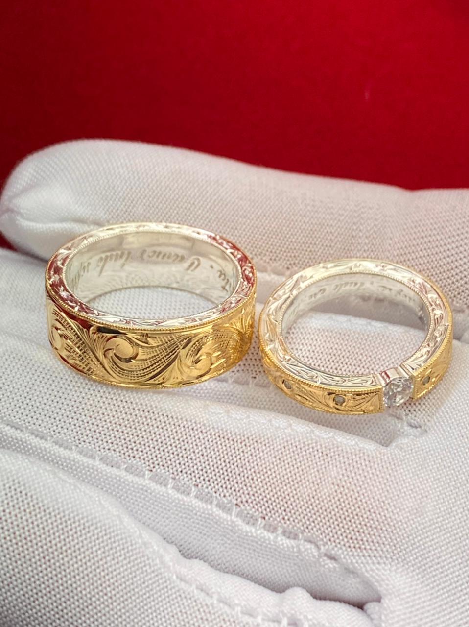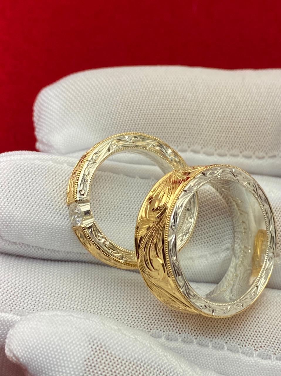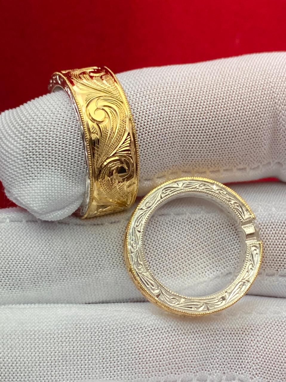 Aliança confeccionada em prata com uma chapa em ouro 18k maciça esculpida à mão com acabamento artístico em alto-relevo.