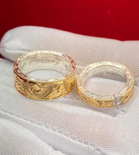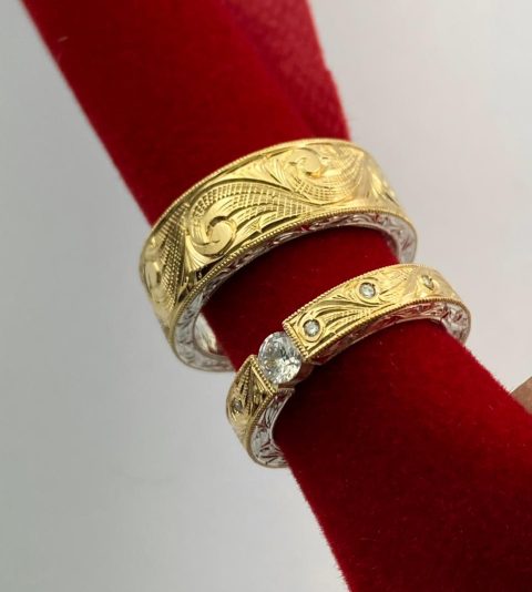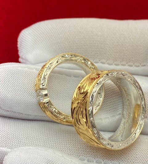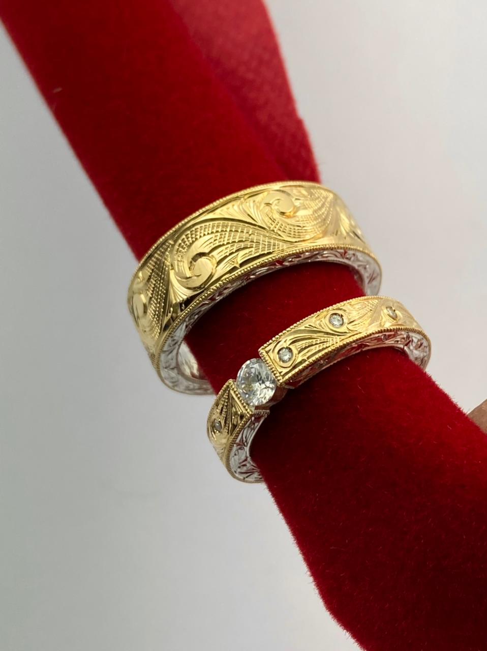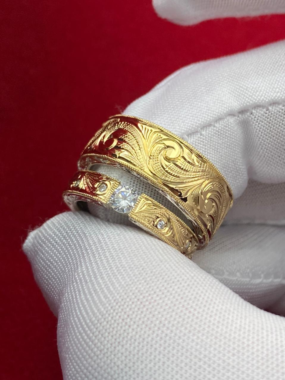 Aliança confeccionada em prata com uma chapa em ouro 18k maciça esculpida à mão com acabamento artístico em alto-relevo.