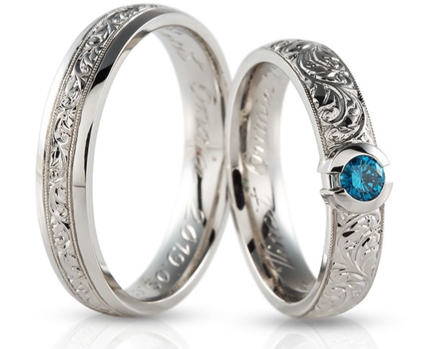 Par de alianças em prata 950, com acabamento polido espelhado e arabescos esculpidos à mão em toda a lateral, trazendo um visual clássico e sofisticado. O modelo feminino é enriquecido com uma Pedra Topázio central, que adiciona um toque de cor, brilho e exclusividade à peça.